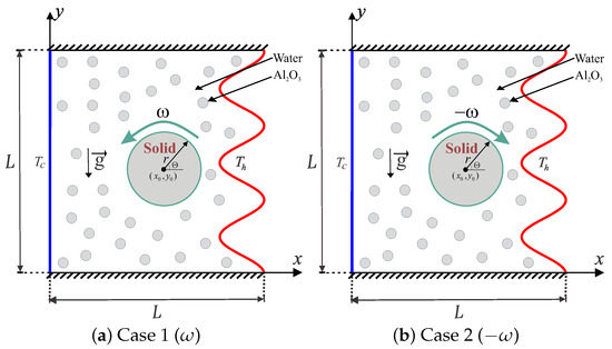 Schematic diagram of the physical model together with the coordinate system for: (a) Case 1, counterclockwise (CCW); and (b) Case 2, clockwise (CW).