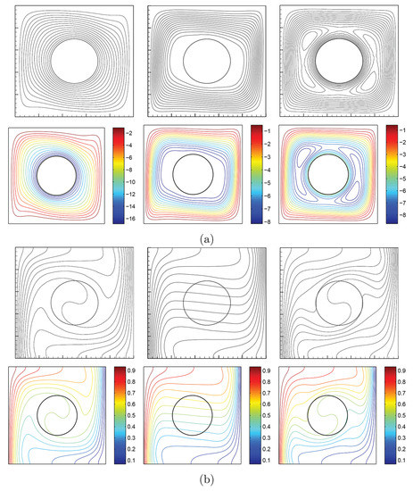 To verify the current numerical data, the outcomes were compared with earlier published numerical outcomes achieved by Costa and Raimundo [13] concerning the problem of mixed convection heat transfer into a cavity filled with pure liquid and heated vertically into the presence of rotating cylinder, as depicted in Figure 2. The streamlines indicate the CW rotation for , 0, and 500. At , the streamlines are more powerful than and 500. In addition, the isotherms show horizontal lines for for both works. Besides, comparisons performed among the existing streamlines, isotherms, and nanoparticles volume fraction inside a free cavity and the numerical ones received by Corcione et al. [41] and Wang et al. [42] are demonstrated in Figure 3, where similar nanoparticle distribution is recorded. In addition, for natural convection flow in a cavity filled with nanofluid utilizing Buongiorno’s two-phase model as exhibited in Figure 4a, the average heat transfer matched the experimental results of Ho et al. [43] and numerical outputs of Sheikhzadeh et al. [44] and Motlagh and Soltanipour [36] with various Rayleigh numbers toward . Figure 4b displays a comparison among the current outcomes and the experimental arrangements of Putra et al. [45] and the numerical result of Corcione et al. [41] using Buongiorno’s model and for various Rayleigh numbers at , , and . Figure 5 gives alternative observations concerning the enhancement in the thermal conductivity and dynamic viscosity due to the addition of the nanoparticles with two different experimental outcomes and the numerical outcomes of Corcione et al. [41] as well. The maximum accuracy of the measurements of thermal conductivity in the study of Chon et al. [46] (experimental) was 3.90%. The accuracy of viscosity measurements in the study of Ho et al. [43] (experimental) was 1%. Based on those validations, the numerical results of the actual numerical code significance to a great level of reliability.