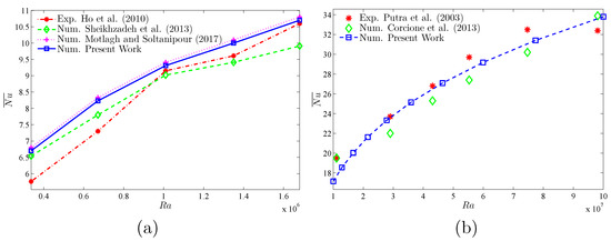 Comparisons of the average Nusselt number of the current numerical work with: (a) the experimental outcomes of Ho et al. [43], numerical outcomes of Sheikhzadeh et al. [44], and numerical outcomes of Motlagh and Soltanipour [36] with various Rayleigh numbers for ; and (b) the experimental outcomes of Putra et al. [45] and the numerical outcomes of Corcione et al. [41] with various Rayleigh numbers at , , and .