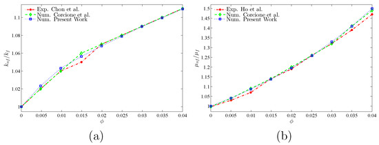 Comparisons of: (a) thermal conductivity ratio between the current numerical results, Chon et al. [46] (experimental), and Corcione et al. [41] (numerical); and (b) dynamic viscosity ratio of the current results with Ho et al. [43] (experimental) and Corcione et al. [41] (numerical) at , , and .