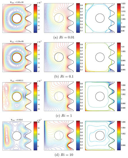 Far from the walls, where the temperature gradients are smooth, a uniform concentration of nanoparticles could be found. The consistent level of nanoparticles at such regions is due to the Brownian motion effects, which tend to move the nanoparticles of an enormous concentration area toward a low concentration one. At the center of the cavity, where the rotating disc is located, there are no nanoparticles, and, hence, there is no concentration gradient. In the case of low Richardson number, the influence of the cylinder’s rotation on the concentration distribution is minimal since the rotation of the solid cylinder remains slow compared via the natural convection flow. In the case of high , the concentration profiles are greatly affected by the rotation and shifted downward. This downward shift is due to the change of the cold flow toward the down bottom of the cylinder.