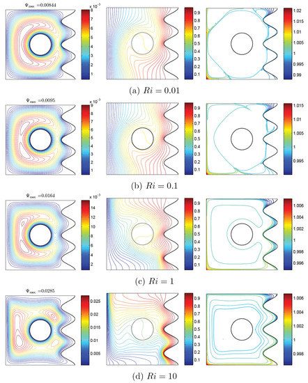 Figure 6 and Figure 7 show the changes of streamlines and isotherms among the changes of Richardson number () and also with clockwise and CCW rotations of the rigid body. In these figures, distribution of volume fraction and remarkable changes with the variations of can be observed. In general, considering the momentum equation, the velocity of nanofluid increases with an increase of , which is indicated in maximum amounts of streamlines. Another notable point observed in streamlines in both states is the occurrence of tiny whirlpools created by the increase of . When is constant, an increase of leads to increase of , and with the addition of buoyancy, the pattern of flow increase and some whirlpools are observed at high values of . In two states, as increases, isothermal lines change with a certain trend, so that with the increase of , isothermal lines of corrugated wall get closer to each other, as clearly observed at the lower corner of cavity. In the mentioned model, nanoparticles movement is affected by two factors: Brownian and thermophoresis. In the state of the low gradient for , the temperature is very high. Thus, nanoparticles travel from the cool wall toward the warm one, as a result of the temperature gradient. Among the rise of and drop of the gradient of temperature, the movement of nanoparticles will be confined to a couple of lines. However, due to Brownian motion, the movement of nanoparticles near the rotating rigid body is observable; therefore, as shown in Figure 6, the nanoparticles travel from the right wavy surface and middle of the cavity to the bottom and left walls, especially the corners of the left wall. This trend can also be seen for nanoparticle distribution in Figure 7. Furthermore, the thermophoresis force tends to move the nanoparticles in a direction opposite to the temperature gradient. At the hot side of a nanoparticle, the liquid molecules are with more energy, and the impact of collision of nanoparticles and the liquid molecules induces a net force. This net force, thermophoresis force, tends to move the nanoparticles from hot to cold. The Brownian motion tends to make the nanoparticles in the liquid uniform. Hence, the Brownian motion exerts a net force on the nanoparticles to move them from a high concentration area to a low concentration one. This way, the Brownian motion and thermophoresis forces adjust the distribution of nanoparticles in a liquid in the presence of notable temperature gradients.