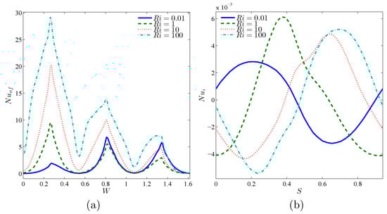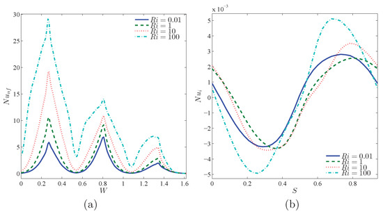 Variations of local Nusselt number interfaces with (a) W and (b) S for different at Case 2 (), , , and .