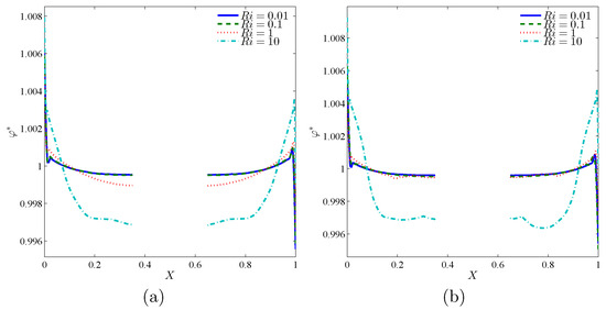 Figure 10 shows the distribution of nanoparticles at the middle plane of the cavity () along the X-direction. Figure 10a,b depicts the results for the rotating Cases 1 and 2, respectively. As seen, both cases show similar behavior except the concentrations near the rotating cylinder. In both figures, a sharp variation of particles concentration next to the hot and cold surfaces can be observed. A high level of nanoparticles could be located at the cold surface. That is due to the thermophoresis effect, which tends to move the nanoparticles of hot to cold zones. Close to the heated surface, the concentration of nanoparticles is low. This is again due to the thermophoresis effect, which sweeps the particles away from the hot surface. The intensity of the concentration boundary layer remains minimum compared to the temperature and hydrodynamic boundary layers. This thin boundary layer is the results of the vast Lewis and Schmidt numbers for nanofluids.