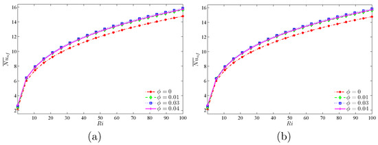 where shows the dimensionless vector of velocity (), is the reference coefficient of Brownian diffusion , is the reference coefficient of thermophoretic diffusion , is Schmidt number, is the parameter of diffusivity ratio (Brownian diffusivity/thermophoretic diffusivity), is the Lewis number, is Reynolds number, is Richardson number, and is the Prandtl number for the base fluid. The dimensionless boundary conditions of Equations (17)–(21) are: