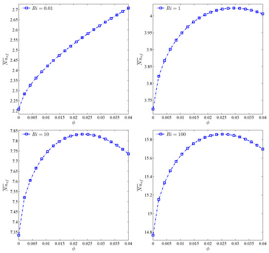 Figure 11 represents the continuous increase of the average , i.e., the heat transfer rate, with an increase of , for both cases. However, the maximum increase of heat transfer is observed at the volume fraction of 3%. To investigate this trend with more analysis at constant amounts of , the effects of variations of volume fraction toward the average was analyzed (Figure 12). For all values of , except for the case of , an optimum point is observed for the average number. This means that, given a constant , increases with the increase of . Thus, forced convection is overshadowed by the free type. In the free convection of nanofluids, an addition of volume fraction along with the rise in viscosity points to the decrease of heat transfer and, hence, for the geometry studied, an increase of volume fraction after passing the maximum score heads to the reduction of . may be considered as the optimum point for volume fraction.