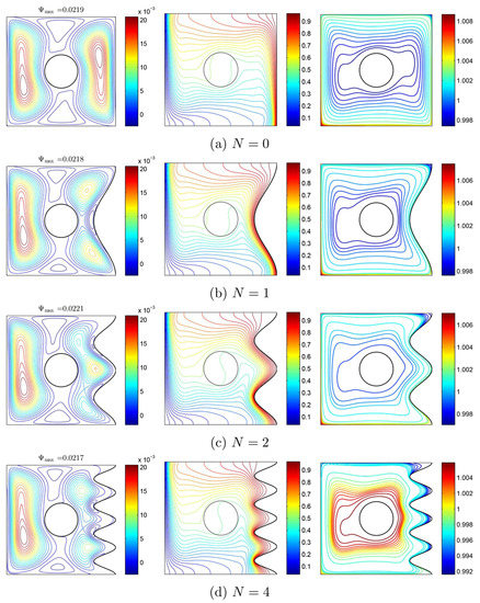 Variations of the (left) streamlines, (middle) isotherms, and (right) nanoparticle distribution evolution by number of undulations (N) for Case 1 (), , , and .