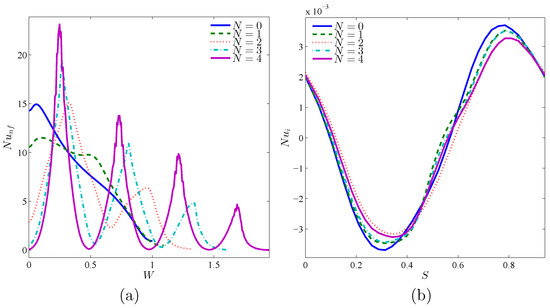 Variations of local Nusselt number interfaces with (a) W and (b) S for different N at Case 1 (), , , and .