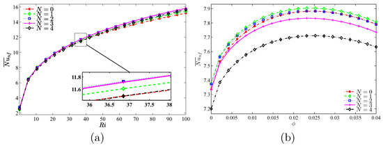 Variations of the average Nusselt number with (a) and (b) for different N at Case 1 (), .