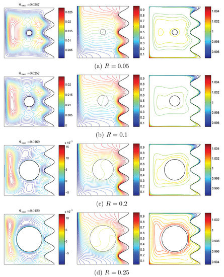 Variations of the (left) streamlines, (middle) isotherms, and (right) nanoparticle distribution evolution by the radius of the rotating cylinder (R) for Case 1 (), , and .