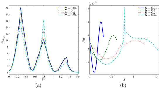 Variations of local Nusselt number interfaces with (a) W and (b) S for different R at Case 1 (), , , and .