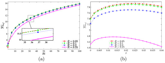Considering Figure 18, the maximum value of the average is seen at , while for low amounts of , the maximum amount of average occurs at . From and at all values of R, the most significant heat transfer is detected at . With the increase of , a different behavior for heat transfer is seen with various values of R. For all values of R, an optimum value of is seen and, for various states of R, the following values for volume fraction can be offered, which result in the highest amount of heat transfer: and as well as and .
