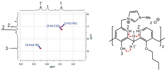 The presence of a cross peak between equatorial ArCH2Ar protons with protons of hydroxyl group (δ = 4.24 and 8.78 ppm) as well as cross peaks between axial ArCH2Ar protons and aryl protons (δ = 3.44 and 7.23, 7.01 ppm) clearly indicates the cone stereoisomeric form of 5.