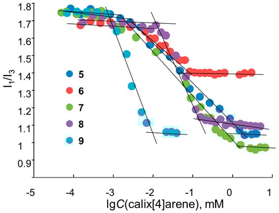 The aggregates formation in the aqueous solutions is typical behavior for calix[4]arenes containing positively charged headgroups and alkyl moieties on the upper and lower rim, respectively [32,33]. To estimate amphiphilic properties of calixarenes 5–9 their critical aggregation concentration (CAC) values were measured using a pyrene fluorescent probe.