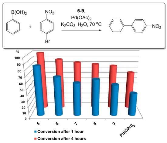3.3. Complexes of 5–9 with Pd(II) Obtained In Situ in Model Suzuki–Miyaura Coupling