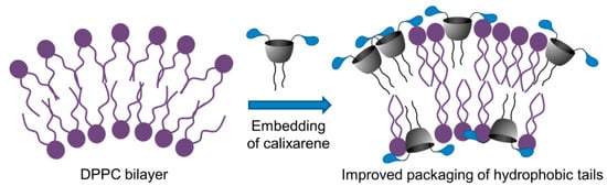 For a single DPPC bilayer Tm is ca. 41 °C [45], while the introduction of surfactants may change this value. Usually a decrease of Tm indicates that the macrocyclic amphiphile disorders the lipid bilayer due to the interaction with lipids and promotes the gel-to-liquid phase transition [46]. In our case Tm values did not change (~40.9 °C) up to a molar calixarene/DPPC ratio of 0.07, after which the increase of calixarene concentration promotes the ordering of the lipid in membranes (Figure 4), which is in line with an increase in the Tm value (43.3 °C). An increase in the temperature of the main phase transition, correlated with the stabilizing effect on the lipid packing, was demonstrated earlier [47] and was explained in terms of an increase in the distribution coefficient value for amphiphile in the gel phase in comparison with the distribution coefficient in the liquid phase.