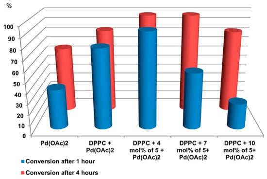 Conversion of 1-bromo-4-nitrobenzene after 1 or 4 h of reaction. C(1-bromo-4-nitrobenzene) = 10 mM, C(phenylboronic acid) = 11 mM, C(K2CO3) = 30 mM, C(DPPC) = 1 мM, C(5 mixed with DPPC) = 43, 65 and 98 µM, C(Pd(OAc)2) = 50 µM, H2O, 70 °C.