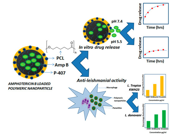 The main objective of this study is the development of polymeric nanoparticles by nanoprecipitation through high-pressure homogenization for the treatment of leishmaniasis. These formulations are desirable to reduce the side effects specifically associated with the oral route of administration. The purpose of using the topical route was to resolve the challenges associated with the low solubility and poor absorption of the drug when administered through the oral route. To accomplish the desired objectives, a combination of high-pressure homogenization (HPH) and solvent diffusion techniques was used to fabricate nanoparticles. Particles of smaller sizes were obtained through the HPH technique, which may be very helpful for topical drug delivery. Furthermore, to the best of our knowledge, Amp B nanoparticles have not previously been formulated and explored in detail using polycaprolactone (PCL) as the only ingredient. Polycaprolactone is a biodegradable polymer used for the delivery of various active moieties through different routes and especially for topical drug delivery [13,14,15]. This approach is able to eliminate the use of relatively scarce and costly ingredients, overcoming economic issues. This method can also provide better drug loading and improved entrapment efficiency. An overview of the experimental work and observations are presented schematically in Figure 1 in order to elaborate the preparation of the polymer nanoparticles with efficient Amp B drug loading and in vitro studies of pH dependent release and anti-leishmanial activities against L. topicana KWH23 and L. donavini.