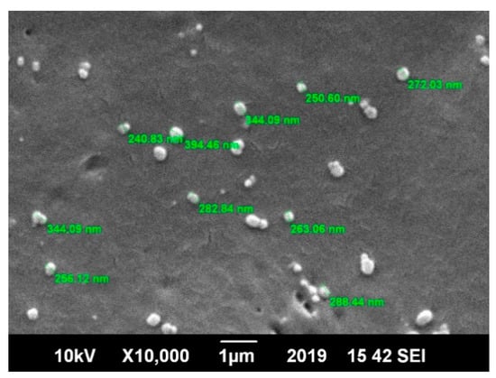 Scanning electron microscopy (SEM) was utilized to determine the size and morphology of the blank and drug-loaded nanoparticles. The SEM image in Figure 3 shows that the prepared nanoparticles were spherical in shape and spatially separated, which confirmed the absence of aggregation. The nanoparticles were uniform in size and shape. This gave a preliminary result about the broadness of the particle size distribution (low polydispersity), which was in excellent agreement with previous studies [21].