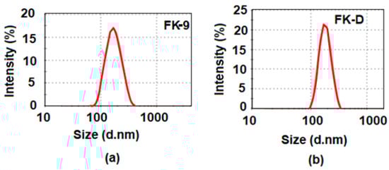 Particle size distributions of (a) blank optimized nanoemulsion (FK-9) and (b) Amp B drug-loaded formulation (FK-D) in PCL polymer nanoparticles.