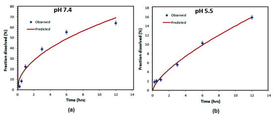 The R-squared value ranges from zero to 1 and provides information on the quality of the regression. For a model that perfectly fits the experimental data, this indicator is equal to unity. Note that the first three models give non-satisfactory fits since R-squared is far from unity, whereas in the case of the Korsmeyer–Peppas model, the good choice of diffusion exponent (n) leads to the very good fit of the experimental data for the two different pH conditions. The diffusion exponent (n) values of Korsmeyer–Peppas plots are 0.499 and 0.694 at pH = 7.4 and pH = 5.5, respectively.