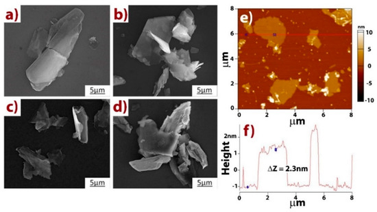 SEM was also performed to characterize the microstructure of the h-BN/MoS2 mixture. Figure 1a–d shows SEM images of h-BN, MoS2, and h-BN/MoS2 nanosheets with different morphologies and sizes. Figure 1a shows a typical SEM image of a large-size h-BN sample, which consists of thin and crumpled sheets with a lateral dimension of about ~5–20 µm. Figure 1b shows the morphology of MoS2. Figure 1c,d shows a typical SEM image of the h-BN/MoS2 mixture, which keeps its features between its single components. Finally, Figure 1e–f presents the AFM image of h-BN/MoS2 and its corresponding height profile (thickness approximately 2.3 nm).