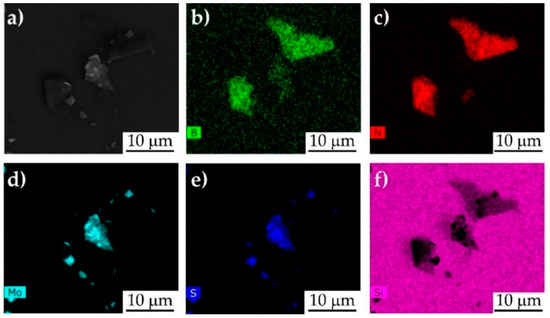 The h-BN/MoS2 mixture can be also confirmed by EDS maps obtained from the SEM image (Figure 2a), which displays the homogeneity of the mixture of h-BN and MoS2. Elements B, N, Mo, and S are uniformly distributed in the whole area according to Figure 2b–e.