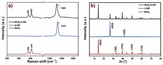 (a) Raman and XRD spectra of h-BN, (b) MoS2 and the h-BN/MoS2 mixture.