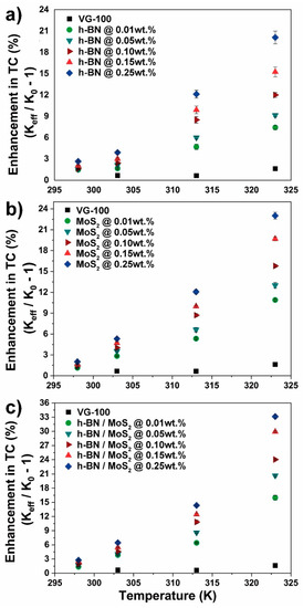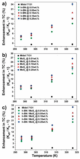 In the hybrid nanofluids, it was observed that at room temperature, the effect of coupling h-BN and MoS2 was similar as a single component reinforcement, either h-BN or MoS2. Moreover, as evaluating temperature increased, the value of thermal conductivity was higher than the single component nanofluids [77,78]. h-BN contributed to the increase of the thermal conductivity as well as MoS2, promoting the dispersion of the nanostructures due to their lubricant properties [38,79].