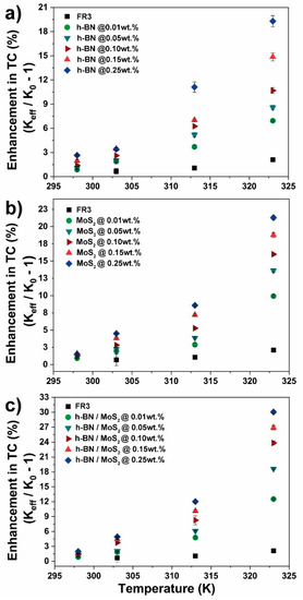 Figure 4a depicts the effect of h-BN on the thermal conductivity of Midel 7131. As filler fraction and temperature is increased, thermal conductivity also increases. For instance, at 323 K, improvements of 12, 14, 15 and 19% are obtained at 0.01, 0.05, 0.10, and 0.15 wt.%, respectively. A maximum enhancement of 24.2% in thermal conductivity was observed at 0.25 wt.% at 323 K. A similar improvement trend was observed for the nanofluids with MoS2 addition (Figure 4b), showing higher enhancement than h-BN reinforcement. Here, the improvement was 16, 19, 20.5, 23 and 26.5% at 0.01, 0.05, 0.10, 0.15, and 0.25 wt.%, respectively. Thermal conductivity showed significant improvement when hybrid nanostructures were applied as reinforcement. In this case, the incorporation of h-BN/MoS2 nanofiller, contributed to improvement, was 20, 22, 24.5, 27 and 32% at 0.01, 0.05, 0.10, 0.15, and 0.25 wt.%, respectively (Figure 4c).