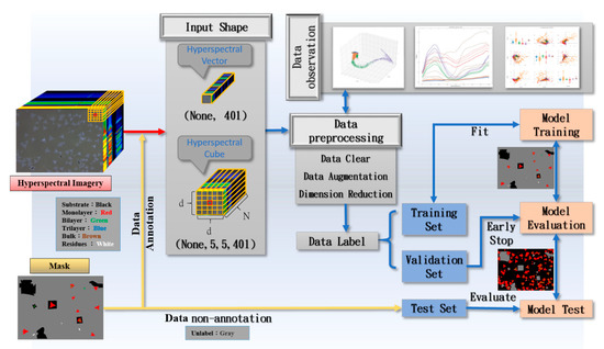 Figure 1 shows the processing step before the data enters the model. Layer number labeling of the manual area circle mask (Mask) is performed and the data are divided when the captured image is converted into a spectrum image by using a hyperspectral image technology; we will measure the result on the basis of the Raman spectrum (Figure S3) [50,51,52,53,54]. The categories are substrate, monolayer, bilayer, trilayer, bulk, and residues, which are our ground truths. Two types of data are available for model training, namely “feature” and “label”. Feature has two types: one is hyperspectral vector as input for deep neural network (DNN) and one-dimensional (1D) convolutional neural network (1D-CNN), and the other is spatial domain hyperspectral cube as input for three-dimensional (3D) convolutional neural network (3D-CNN). After data preprocessing, we divide the dataset into three parts. We randomly select 80% of the labeled samples as training data, 20% as the verification set, and the remaining unmarked parts for the test set. As the light intensity distribution is incompletely covered in the dataset in the training and validation sets, we need a test set to help us measure whether the model has this capability.