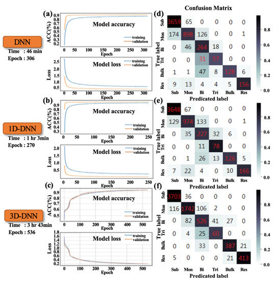 At 10× magnification condition: accuracy (ACC) and loss in the convergence process in (a) DNN, (b) 1D-CNN, and (c) 3D-CNN; confusion matrix results of the validation set in (d) DNN, (e) 1D-CNN, and (f) 3D-CNN.