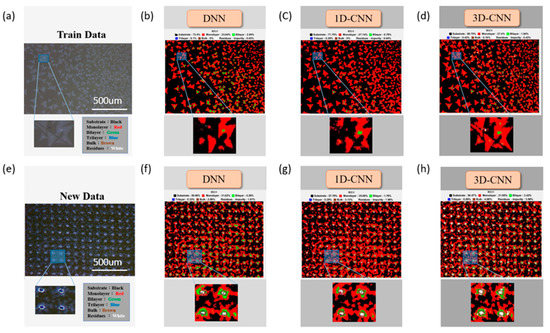 At 10× magnification: (a,e) optical microscopy (OM) images of the training (train data) and new test (new pending data) data, respectively; predicted results of the color classification image (false-color composite) under three models for the training data (b–d), namely, (b) DNN, (c) 1D-CNN, and (d) 3D-CNN, and for the new pending data (f–h), namely, (f) DNN, (g) 1D-CNN, and (h) 3D-CNN.