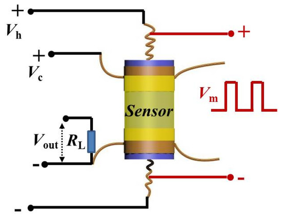 The schematic diagram of the sensor elements [28] is shown in Figure 1. A proper amount of sample powder was uniformly coated on a ceramic tube as a sensing film layer. A Ni-Cr alloy resistor was set through the tube as a heater, and the operating temperature was adjusted by the heating voltage. In this scenario, VC is the test voltage with a certain value of 5 V, VH is the heating voltage modulated on the Ni-Cr coil, Vm is the heating pulse voltage, Vout is the output voltage on RL, and RL is a load resistor in series with the gas sensor. With the recorded Vout values of the load resistor, the equivalent resistances of the sensor can be calculated.
