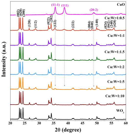 XRD patterns of the CuO/WO3 composites with different Cu/W molar ratios.