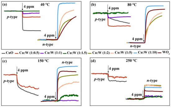 Dynamic curves of the CuO/WO3 composites with different Cu/W molar ratios upon 4 ppm H2S gas at (a) 40 °C, (b) 80 °C, (c) 150 °C, and (d) 250 °C.