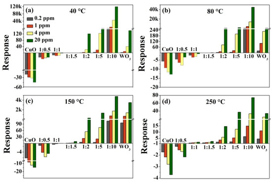 CuO/WO3 (1:0), (1:0.5), and (1:1) sensors all display p-type responses. Because the amplified resistance due to CuO is weakened by the reduced resistance derived from WO3, CuO/WO3 (1:0.5) exhibits a poorer p-type response in comparison to CuO. Moreover, such a weakening mode is much more significant with an increase in the CuO content; CuO/WO3 (1:1) demonstrates the lowest p-type response at the temperature of 40 °C–150 °C. However, at a higher temperature of 250 °C, CuO/WO3 (1:1) presents a small n-type response, indicating that the contribution of WO3 excels that of CuO. Because it will accelerate the Cu-S bonds breaking and the Cu-O bonds combining at high temperatures, the generated CuS was converted to CuO simultaneously. Ultimately, the CuS formation is negligible, which greatly reduces the CuO contribution to the total response. Furthermore, the CuO/WO3 (1:1.5) sensor has no response at temperatures of 40 °C–80 °C, since the sensor’s resistance is basically constant—that is, the weakening mode of n-p type maximizes at such temperatures. In addition, it has a very weak n-type response at temperatures of 150 °C–250 °C; this phenomenon is analogous to that of the CuO/WO3 (1:1) sensor at 250 °C.