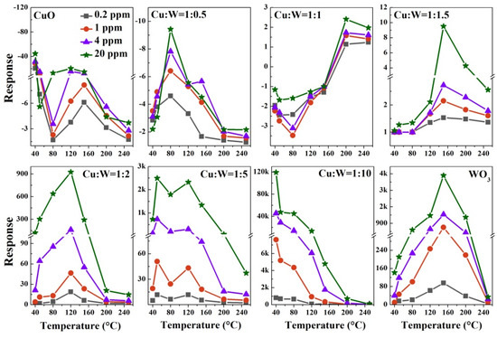 Figure 7 displays the responses of the CuO/WO3-based sensors as a function of operating temperature toward 0.2, 1, 4, and 20 ppm of H2S gas. The optimum working temperature of CuO is lower than that of CuO/WO3 (1:0.5) because it facilitates the CuS formation at low temperatures due to sulfurization [26,49], and CuO is more dominated by the CuS formation mechanism than CuO/WO3 is (1:0.5). On account of the weakening mode of the n-p type, CuO/WO3 (1:1) has no response at low temperatures and its best operating temperature tends to be high. For the CuO/WO3 (1:1.5, 1:2, 1:5, and 1:10) sensors, their optimal operating temperatures reduce with a decrease in the CuO content; the reason for this may be that the interface barrier of the micro-CuO/WO3 composites is more easily broken upon H2S injection. The CuO and CuO/WO3 (1:1 and 1:5) sensors all display the two optimal working temperatures. The H2S oxidation dominates the sensing process at higher temperatures and the CuS formation plays a main role at lower temperatures, since the O-S exchange reaction is spontaneous and the oxygen ionosorption process is suppressed at low temperatures. On the other hand, the barrier destruction and weakening mode of the n-p type also work in the sensing process.