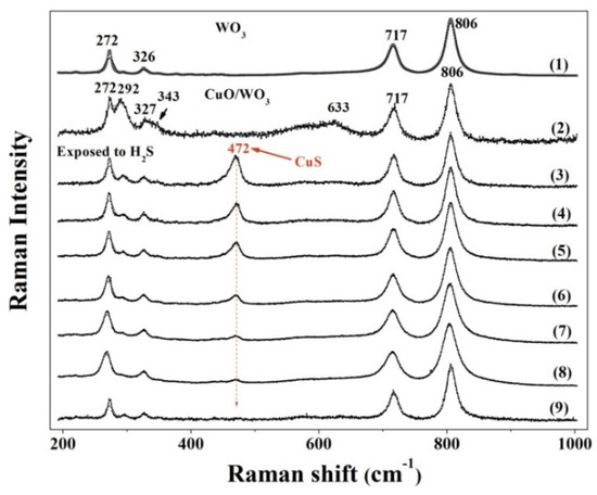 Raman spectroscopy is exploited in each step of the sensing process in order to confirm the CuS formation during the sensing process. As shown in Figure 8, the black lines are raw data measured under varied intensities of laser radiation. Curve (1) is the Raman spectrum of the pristine WO3 sample, which has been annealed at 500 °C in ambient condition for one hour, where the main bands located at 806 and 717 cm−1 correspond to the O-W-O stretching modes and the peaks at 326 cm−1 and 272 cm−1 are identified as O-W-O deformation modes [50,51]. All the Raman peaks of the WO3 sample are sharp and strong. The broad bands below 500 cm−1 could be deconvoluted into several peaks due to deformation and lattice vibrations. The main bands of curve (2) located at 292, 343, and 633 cm−1 evidence the presence of CuO [52]. When the CuO/WO3 (1:1) sample is exposed to H2S gas under 2 mW laser radiation, as shown by the curve (3), a very sharp band is observed at 472 cm−1, which is the signature of Cu-S bonding [53,54]. As stated previously, the high temperature facilitates the breaking of the Cu-S bonds, which weakens the CuS formation contribution to the p-type response of CuO. To understand the heating effect on CuS decomposition, the power of the laser radiation is increased from 2 to 14 mW to mimic the elevated operating temperature. The local temperature of the area under laser irradiation could rise. After “increasing temperature”, the intensity of the Raman peak at 472 cm−1 decreases gradually and finally vanishes, as shown by the curve (3)–(9). This evidences the breaking of Cu-S bonds due to the thermal effect of the laser beam.