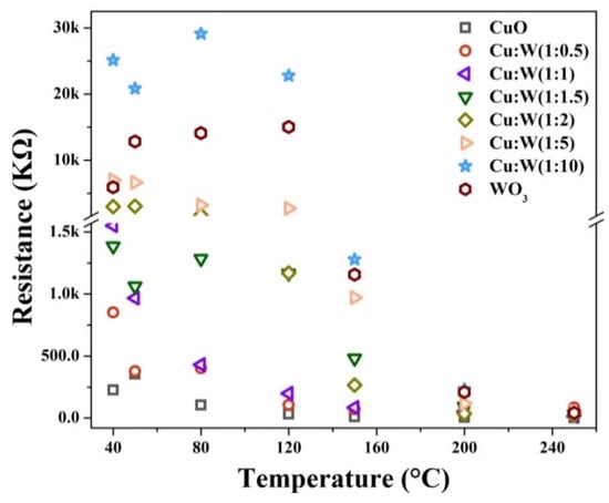The baseline resistance values of the CuO/WO3 composites at different operating temperatures.