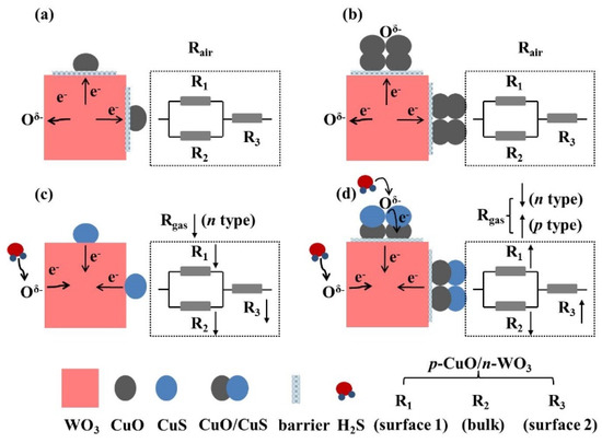 The sensing process in the CuO/WO3 composites with different CuO contents is schematically illustrated in Figure 10. It is assumed that the resistance of the macroscopic sensor is a combination of those of countless microstructures; the p-CuO/n-WO3 nanostructure, on exposure to air, could be looked upon as that the total resistor (R) results from the surface resistances (R3) connected in series with the effective resistance (the result of the parallel combination of the surface resistance (R1) and bulk resistance (R2). As exhibited in Figure 10a,b, a lot of oxygen molecules in air are chemisorbed on the surfaces of the CuO/WO3 composites based in depletion theory. These adsorbed oxygen molecules become ionized oxygen species Oδ− (e.g., O2−, O−, and O2−) by grasping free electrons from the conduction band of nanomaterials. When the n-type WO3 and the p-type CuO are brought into contact in the air, heterojunction barriers were constructed between the CuO nanoparticles and WO3 nanocubes by consuming a lot of electrons from WO3.