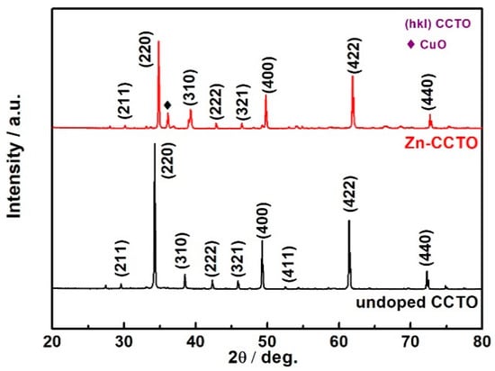 Raman spectra measurements were performed on samples after laser sintering of the precursors, shown in Figure 3. As the modes of Raman show, there are peaks located at 446 cm−1, 513 cm−1, and 576 cm−1 for undoped CCTO which is in accord with previous reports [24,25,26]. The Raman shift of 446 cm−1 corresponds to the modes of Ag(1) and Fg(2), and the peaks at 513 and 576 cm−1 correspond to Ag(2) and Fg(3), respectively. The modes of Ag(1), Ag(2) and Fg(2) are ascribed to lattice vibrations in TiO6, and Fg(3) reflects the vibration mode of adverse stretching for the O–Ti–O bond [24,27]. The Raman vibration modes of Zn-doped CCTO show a shift to lower frequencies at 442 cm−1, 506 cm−1, and 570 cm−1, assigned to Ag(1)/Fg(2), Ag(2), and Fg(3), respectively. This could be attributed to Zn ion incorporation affecting the structure of CCTO. The weakness of the relative intensity for the Raman peaks in Zn-doped CCTO, especially for the Ag(2) mode, demonstrates that Zn doping changes slightly the lattice vibrations of the titanium–oxygen octahedron.