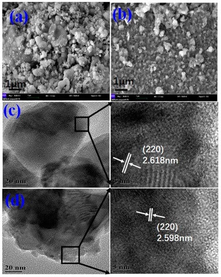 The SEM and HRTEM images for prepared undoped (a,c) and Zn-doped CCTO (b,d).