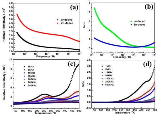 The relationships of frequency and permittivity, loss for undoped (a) and Zn-doped CCTO (b). Permittivity and loss for Zn-doped CCTO measured from 30 to 500 °C (c,d).
