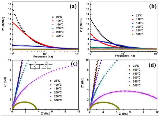The real part (Z’) versus frequency (a,b) and complex impedance plots (c,d) for undoped CCTO (a,c) and Zn-doped CCTO (c,d), respectively, with a measured temperature of 25–300 °C. Inset in (c) shows the two parallel RC equivalent circuits in series.