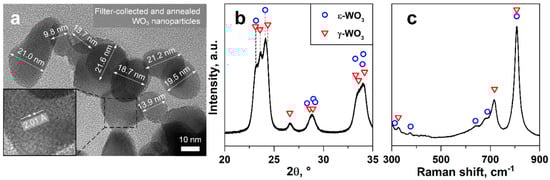 Material characterization. (a) TEM image with marked primary particle sizes in nm with inset at higher magnification, showing the lattice orientation and spacing in Å. (b) XRD pattern and (c) Raman spectrum of the filter-collected and annealed WO3 particles. Reference peak positions of monoclinic γ-WO3 (triangles, ICSD 80056) and ε-WO3 (circles, 84163).