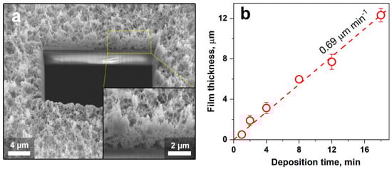 Figure 2a shows a cross-sectional SEM image of a film after 4 min deposition. The film consisted of agglomerated WO3 nanoparticles, similar to the filter-collected ones (Figure 1a), forming a fine network with the large specific surface area—a characteristic for such flame-made films [33]. The resulting open film structure (Figure 2a, inset) provided large pores for rapid NO2 diffusion into the film. In fact, the porosity of the 4-min deposited WO3 film was 96.8 ± 0.1% (Table S2), in good agreement with similarly made Pt-doped SnO2 films [33]. Most importantly, the films were crack-free (e.g., compared to wet-phase deposited ones [32]), exhibited a homogeneous thickness across the entire cross-section, and their morphology was independent of deposition time (Figure S4). Please note that the more compact structures at the cutting edge were caused by melting during FIB.