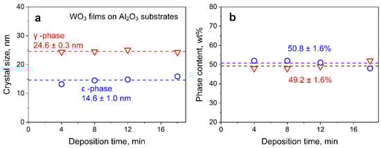 The Raman spectrum supported the coexistence of γ- and ε-phases in the WO3 films (Figure 1c). The main reflection at 805 cm−1 could be assigned to both γ- [62,63] (triangles) and ε-phases [57] (circles), while peaks at 324 and 715 cm−1 were related only to the γ-phase [62,63]. The shoulders at 350–400 and 600–700 cm−1 suggested the presence of ε-phase peaks at 376, 642, and 688 cm−1 [57]. The fusion of the two peaks into a shoulder at 600–700 cm−1 rather than two distinct peaks (as observed for pure γ-phase) was most likely due to the small ε-phase crystal size (as estimated by XRD), which leads to peak broadening [64]. This shoulder increased with increasing ε-phase content [36].