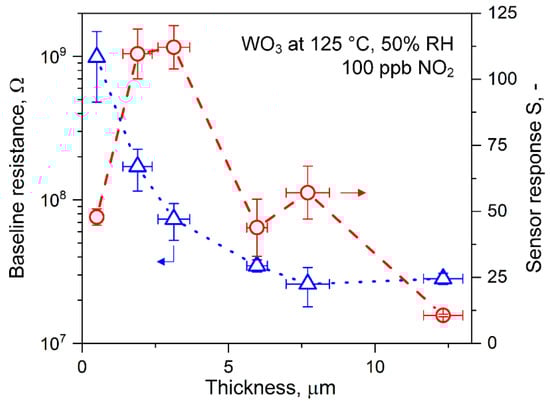 Film morphology optimization is an effective route to improve sensing performance [28]. Consequently, film thickness, porosity, pore size, and available surface area affect analyte’s penetration depth and interaction probability and, thus, sensor sensitivity. In fact, for sputtered WO3 films, the optimum NO2 response has been reported at ~85 nm thickness in the range of 40 to 200 nm [23]. Besides, the NO2 sensitivity of WO3 lamella stacks prepared by precipitation increase with porosity by adding hydrothermally-made SnO2 nanoparticles as spacers [29], though, chemical sensitization by SnO2 might also play a role. In addition, layer-by-layer inkjet printing has been used to obtain different thicknesses of Cu2O and CuO films for NO2 sensing; however, the effect of film thickness on sensor sensitivity and selectivity was not investigated [30]. Changes in film morphology (e.g., thickness, porosity), however, are accompanied typically by process-related changes, for instance, altered crystal size (e.g., during sputtering [23]) or additives [29]. As a result, also the transducer function in the sensing nanoparticles may be altered, making it difficult to associate increasing sensor performance unambiguously to film thickness. Cracks may also form during sensor film preparation (e.g., screen-printing [31] or doctor-blading [32]) that increases with increasing thickness [32] and can affect performance.