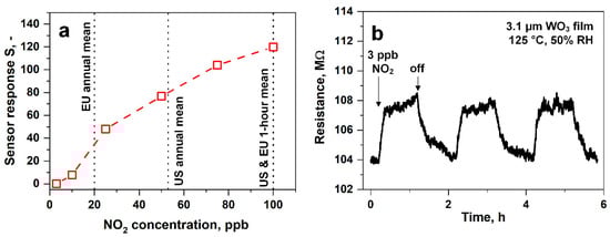 Low ppb NO2 detection. (a) Sensor responses of the thickness-optimized WO3 film (3.1 µm) in the relevant concentration range from 3 to 100 ppb NO2 measured at 50% RH (at 23 °C) and 125 °C. Threshold exposure limits from the EU [5] and the US [3] are indicated by dashed lines. (b) Film resistance upon consecutive exposure to 3 ppb NO2.